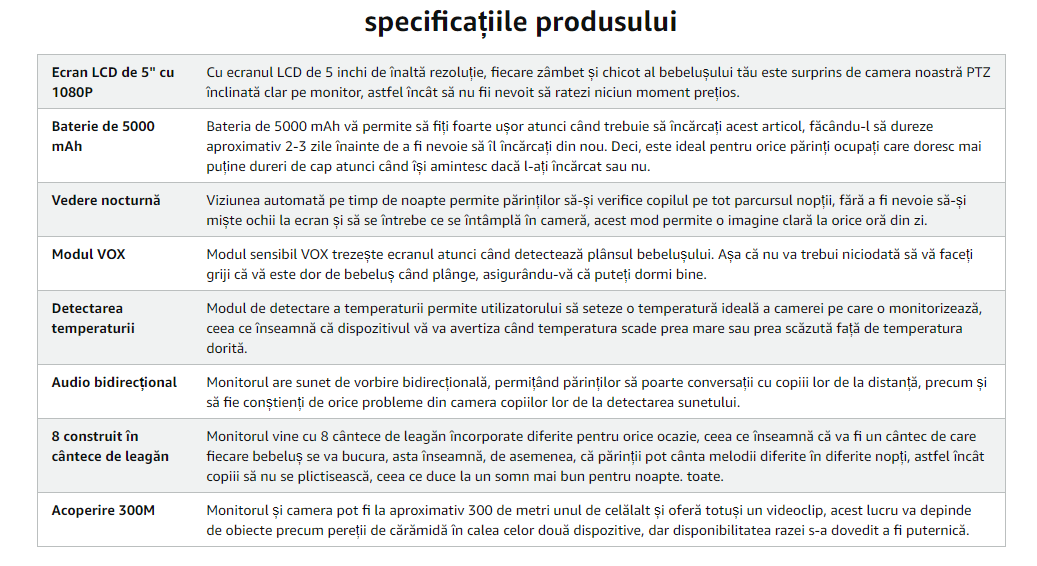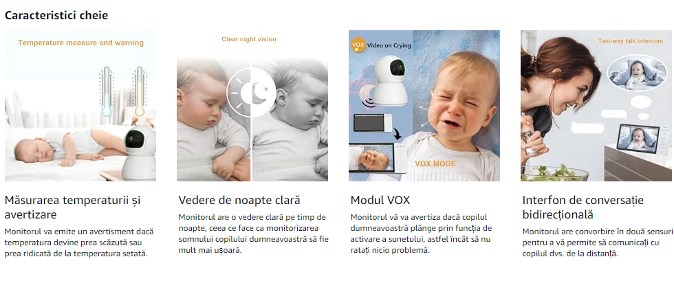 Vorbire in doua sensuri si cantece de leagan: Caracteristica audio bidirectionala clara de pe aceste monitoare pentru bebelusi cu camera si sunet permite conversatii la ambele capete la fel de clare ca si cum ai fi in aceeasi camera cu micutul tau. Cantece de leagan linistitoare pentru a va ajuta copilul sa se relaxeze si sa se distreze. Cantece de leagan grozave atunci cand copilul are dificultati de somn.