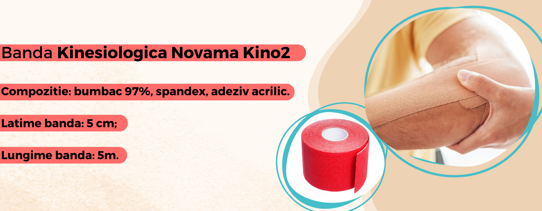 Banda Novama Kino2 este destinata fizioterapiei analgezice, ortopedice, neurologice, postoperatorii si sportive. Aceasta amelioreaza durerea, reduce tensiunea musculara, precum si staza si limfedemul.