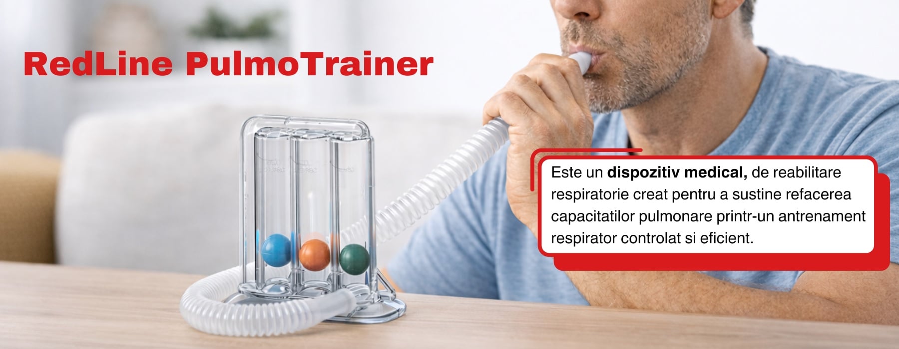 Spirometrul RedLine PulmoTrainer este un dispozitiv medical, de reabilitare respiratorie creat pentru a sustine refacerea capacitatilor pulmonare printr-un antrenament respirator controlat si eficient.
